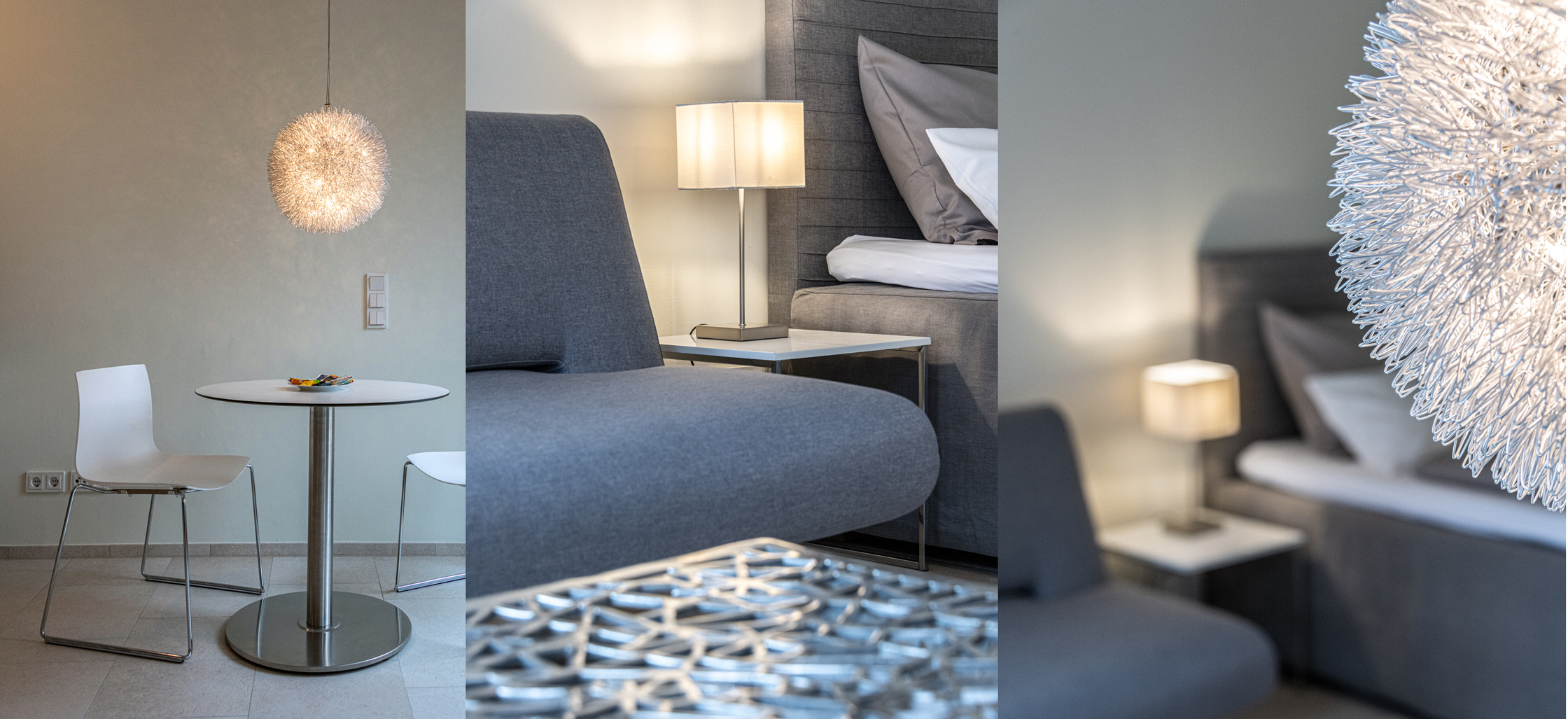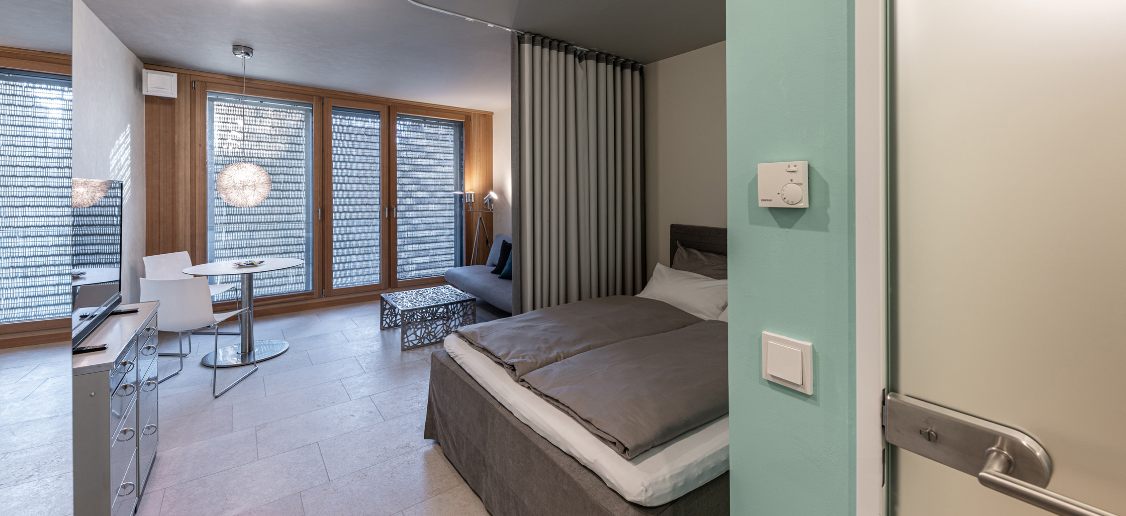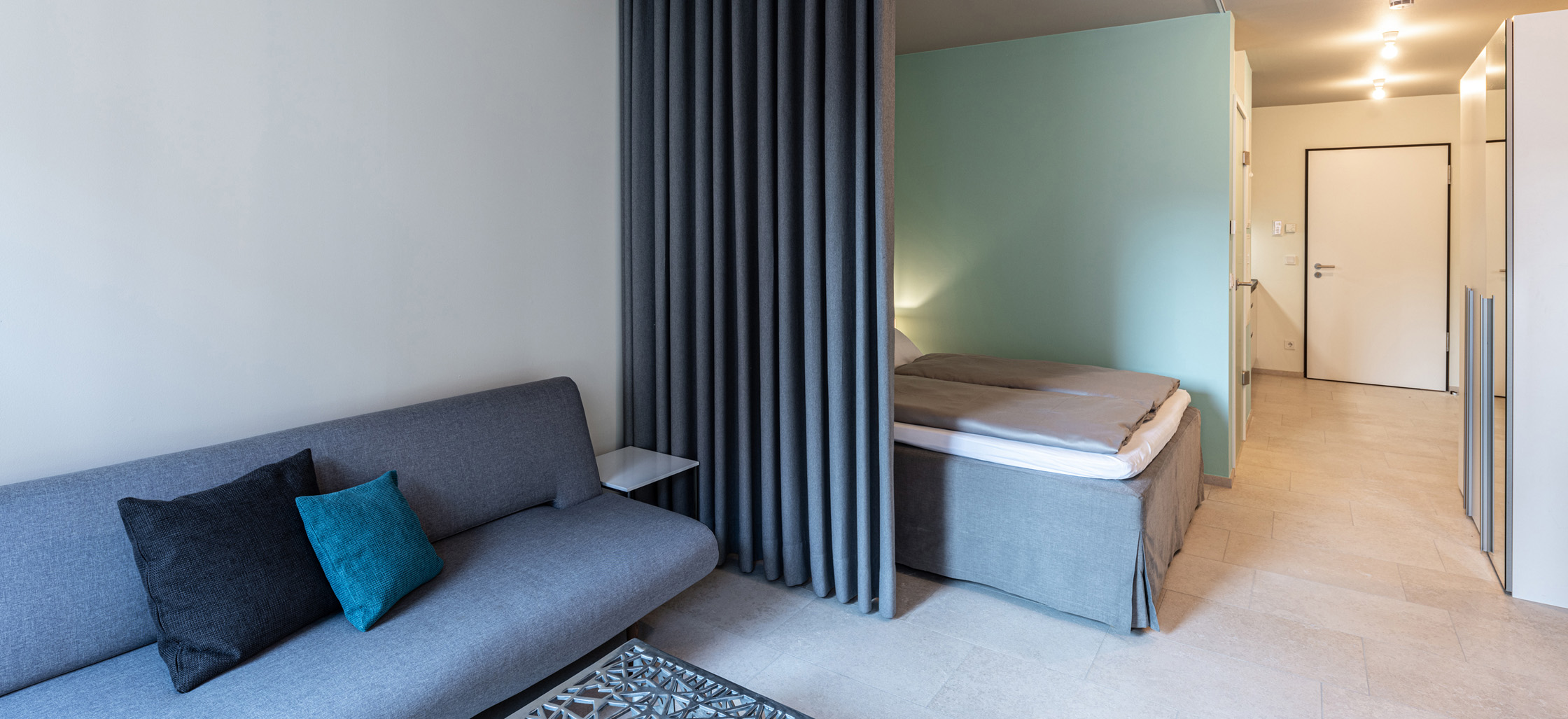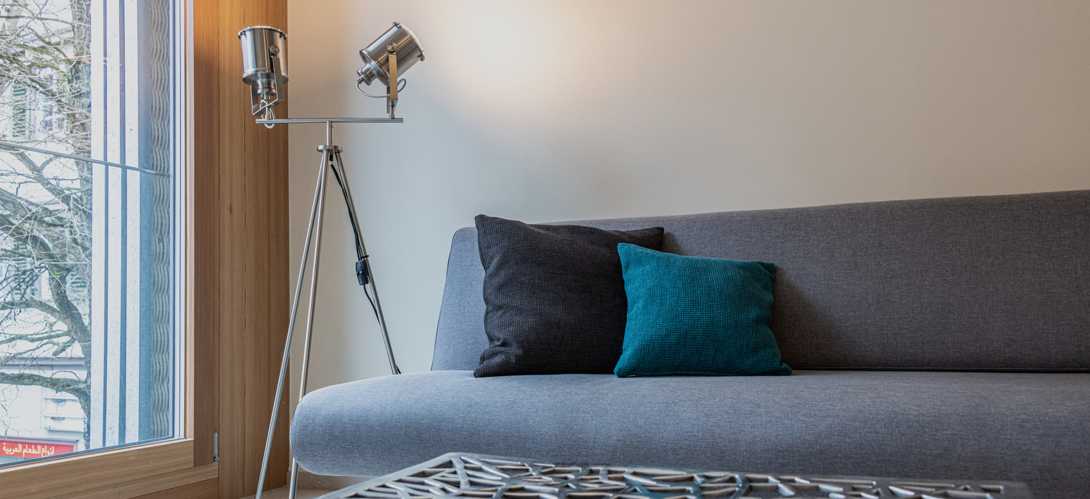 - Geräumiger Wohnbereich: Entspannen Sie sich nach einem langen Arbeitstag in unserem gemütlichen Wohnbereich mit Flachbild-TV und bequemen Sofa und Esstisch mit zwei Stühlen.