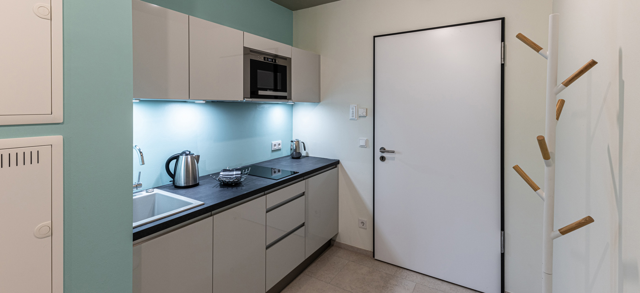 Willkommen in Ihrem azurblauen Apartment W03, das perfekt auf die Bedürfnisse von Reisenden zugeschnitten ist und auch für längere Aufenthalte ausreichend Raum bietet. Unser Apartment glänzt mit einer durchdachten Kombination aus Komfort, Funktionalität und modernem Design.