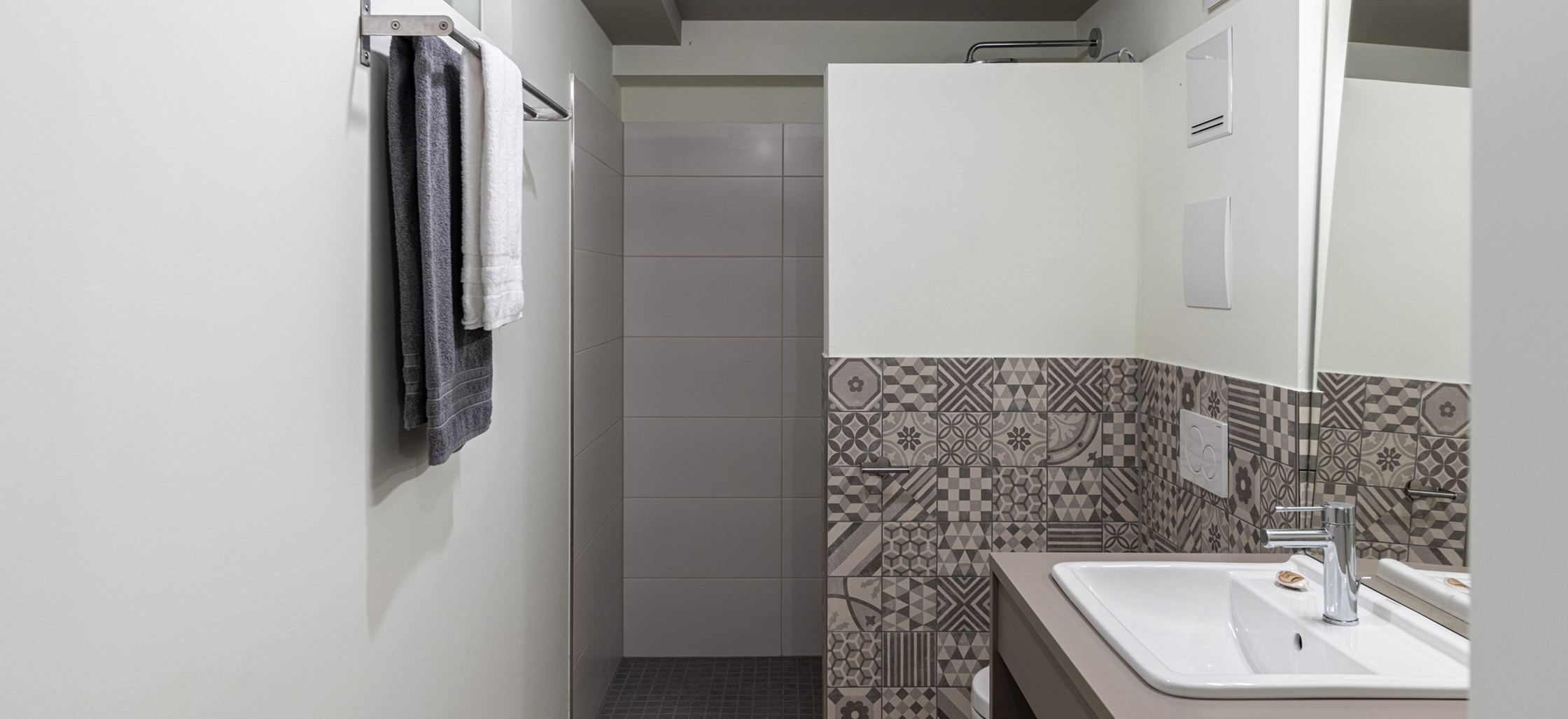 - Badezimmer: Das elegante Badezimmer ist mit einer Dusche, frischen Handtüchern und WC ausgestattet.
