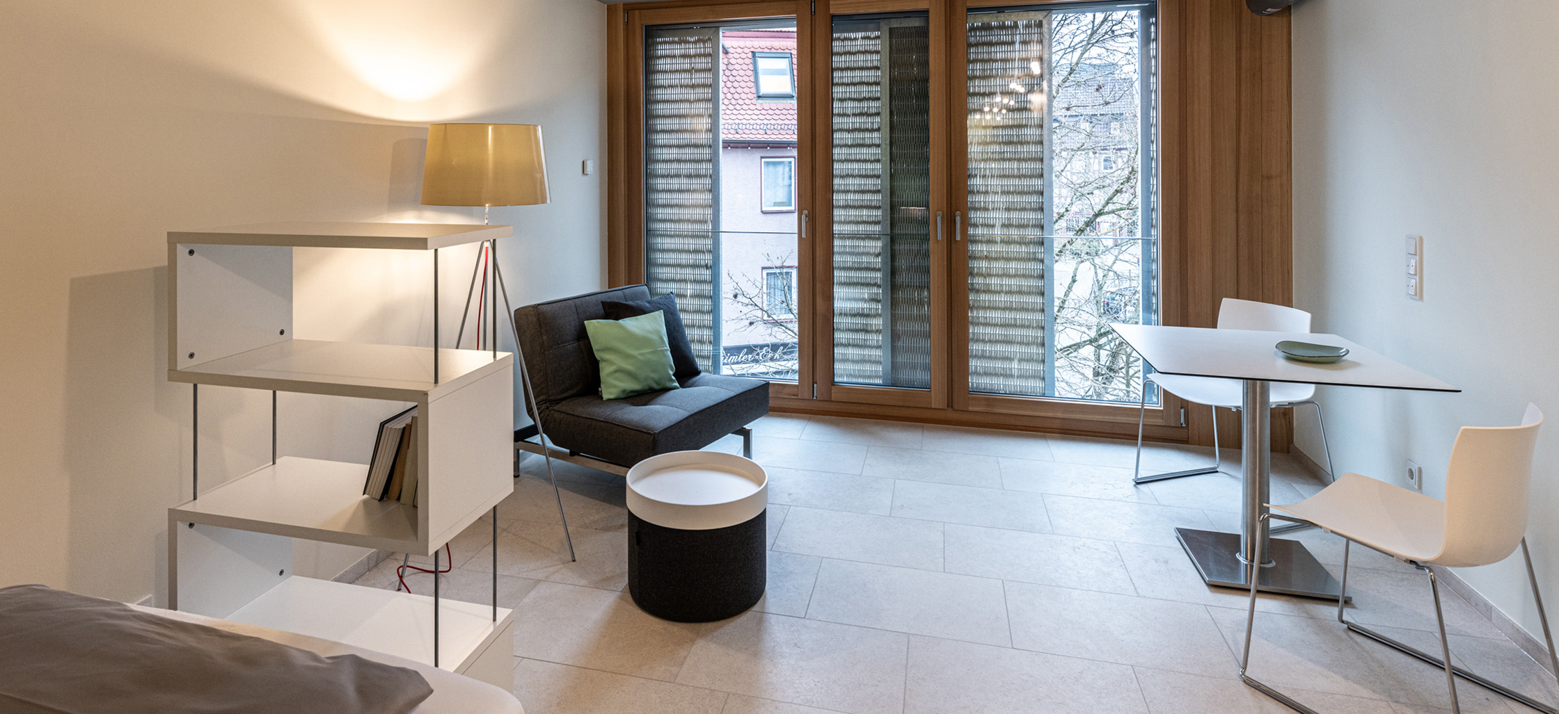 - Geräumiger Wohnbereich: Entspannen Sie sich nach einem langen Arbeitstag in unserem gemütlichen Wohnbereich mit Flachbild-TV und bequemen Sessel und Esstisch mit zwei Stühlen.